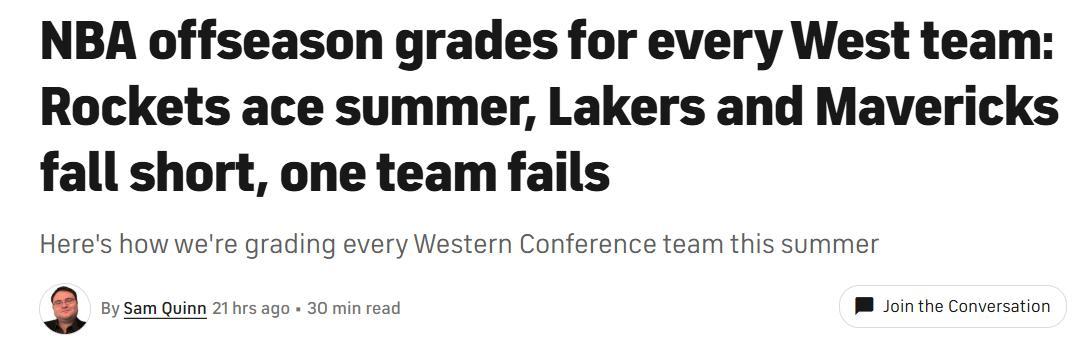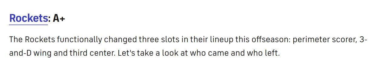 火箭队获A+高评分!在休赛期第一波大幅度引援与签约结束后,美媒《cbs sports》根据各支球队操作公布西部15队休赛期至今操作评分,其中快船获B评分,湖人队只得到C-,同时仅勇士一支球队评分待定。