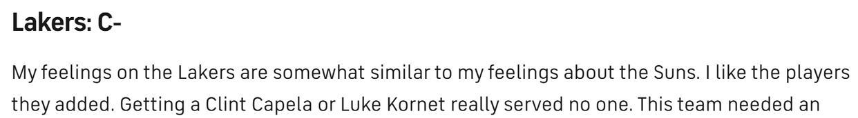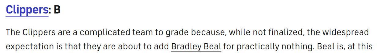 加上领跑保罗与比尔争夺战,如果快船队最终可以拿下两人,或者至少拿下比尔,他们的评分就将进一步提升至B+。