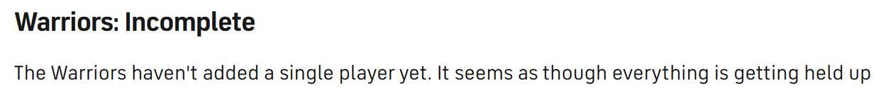 哪怕最终拿下霍福德,由于卢尼的离开,以及自由市场中优质球员所剩不多,勇士队也很难拿下一个高评分,除非让库明加接受了一份远低于身价的多年期合同。